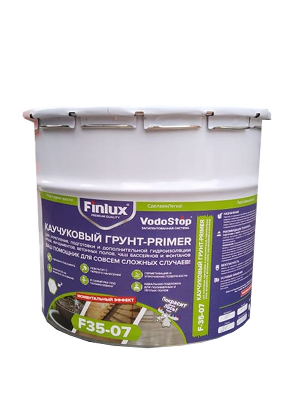 Finlux VodoStop F35-07 – инновационный гидроизоляционный грунт праймер (primer) для защиты бетонных полов и оснований в помещениях без отопления и с высокой влажностью. Грунт универсальный, причем высококачественные компоненты позволяют использовать грунтовку в качестве подготовительной подложки под: • покрытия на основе «Полимочевины»; • чаш фонтанов и бассейнов; • систему «Теплый пол»; • кафельную плитку; • подготовить и защитить бетонное основание во влажных и сырых помещениях. Предварительное грунтование имеет ряд свойств в отличии от битумного: ? Создание хорошей основы с высокой адгезией для последующего нанесения любого полимерного покрытия. ? Уменьшение впитывающей способности пористых поверхностей. ? Упрочнение отмеливающихся и непрочных поверхностей. ? Проведение антисептической обработки. ? Простое и удобное нанесение. Финлюкс ВодоСтоп Ф35-07 – однокомпонентная, готовая к применению полиуретановая грунтовка для бетонного пола на основе финских и японских компонентов. Finlux - справится даже Лось!