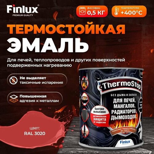 Краска, Грунт-Эмаль Finlux F-1200 до +1200C Антикоррозионная, для печей, мангалов, дымоходов, радиаторов, суппортов, глушителей Гладкая, Быстросохнущая, Матовое покрытие, ral 3002, 0,5 кг, 400 С