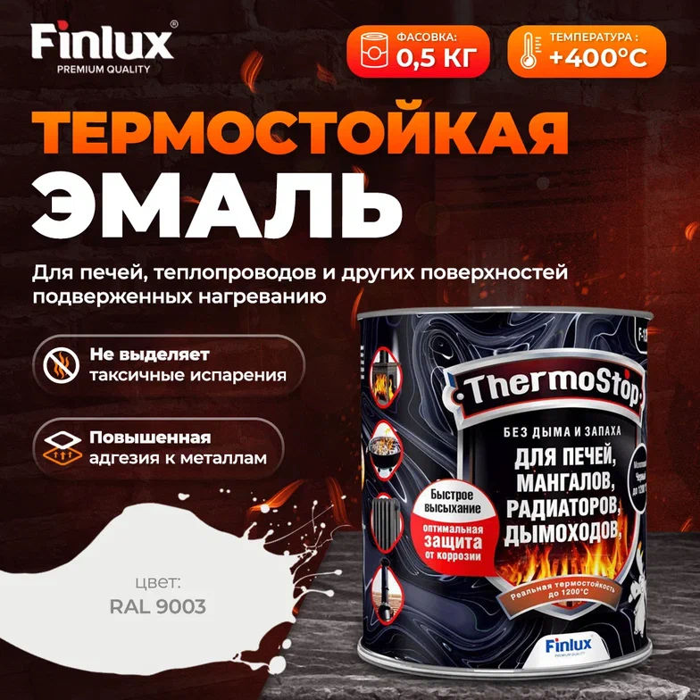 Грунт-Эмаль Finlux F-1200 до +1200C для печей, мангалов, дымоходов, радиаторов, суппортов, глушителей, матовое покрытие, ral 9003, 0,5 кг, 400 С
