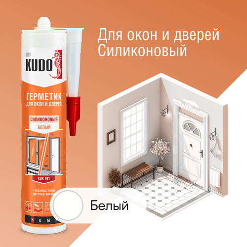 Устойчив к УФ-излучению, воздействию чистящих и моющих средств.Имеет широкий температурный диапазон эксплуатации: от –40°С до +180°С.Время образования поверхностной плёнки — 15–30 мин.Скорость отверждения герметика — 3 мм в сутки (при температуре +23°С и относительной влажности 50%).На 20–22 погонных метра при диаметре валика 4 мм.Предназначен для герметизации оконных рам и дверных коробок, примыканий конструкций к стене, для уплотнения, соединения и защиты непористых поверхностей от проникновения воздуха и влаги, от УФ-лучей. Характеризуется отличной адгезией к нержавеющей стали, анодированному алюминию, стеклу, керамической плитке, пропитанной или лакированной древесине, эпоксидной смоле, ламинату, большинству красок, многим пластикам, таким как полиэфир, полиакрилат. Быстро покрывается плёнкой.Силиконовый герметик для окон и дверей KUDO® устойчив к воздействию большинства моющих и чистящих средств, стоек к УФ- излучению, атмосферным воздействиям, температурным перепадам и практически любым агрессивным средам.Тиксотропный, не растекается и не сползает по шву. Сохраняет эластичность после отверждения.Применение:Работы рекомендуется проводить при температуре от +5°С до +40°С, температура герметика должна составлять +20…25°C.Герметик наносить на чистые, сухие и обезжиренные поверхности.Разгладить герметик в шве влажным шпателем.Инструменты и запачканные поверхности очистить до отверждения герметика при помощи растворителя (ацетон, уайт-спирит).Затвердевший герметик удалить механическим способом.