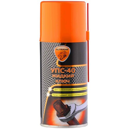Открутить приржавевшую гайку и чтобы не нанести вред резьбе - задача не из самых простых. Для того чтобы упростить задачу откручивания, Вам на помощь придет жидкий ключ ELTRANS УПС-40Универсальное проникающее средство (УПС-40) применяется для облегчения отвинчивания резьбовых соединений всех типов, обладает высокой проникающей, пропитывающей и растворяющей способностью. Незаменимо при ремонте любых транспортных средств, применяется для сантехнических и слесарных работ. Быстро проникает внутрь ржавчины, растворяет её, возвращает подвижность и смазывает резьбовые соединения, петли, замки. Предотвращает заклинивание и срыв резьбы, устраняет скрип и заедание деталей. Аэрозольная форма выпуска облегчает обработку труднодоступных соединений. Способ применения:1. Использовать при температуре не ниже +10С. 2. Перед использованием энергично встряхнуть баллон в течение 1-2 мин. Распылить состав на обрабатываемые детали. 3. Дать впитаться в течение 15-20 мин.Преимущества: Прост в использовании; Оставляет защитную пленку; Устраняет скрипы и вытесняет влагу с поверхностей; Обладает проникающими и смазывающими свойствами; Быстро испаряется с поверхности деталей; Быстро возвращает подвижность заржавевшим деталям; Предотвращает последующие окисление деталей.