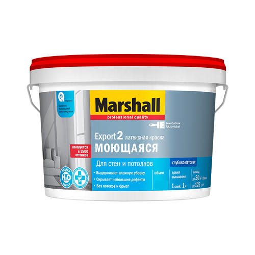 Marshall Export-2 - глубокоматовая краска на водной основе, обеспечивающая безупречно гладкое покрытие, устойчивое к влаге и износу.ПреимуществаБыстрое высыхание за два-четыре часа.Отсутствие резкого запаха.Нанесение без брызг и потеков кисточкой, валиком или распылителем.Отличная укрывистость.Маскировка небольших изъянов основания.Область примененияКраска Marshall Export-2 предназначена для окрашивания стен и потолков внутри помещений. Благодаря экологичному составу подходит для использования в детских и оздоровительных учреждениях.Бренд Marshall принадлежит концерну AkzoNobel, ведущему мировому производителю лакокрасочной продукции. Компания имеет представительства более чем в 150 странах, штаб-квартира находится в Нидерландах.