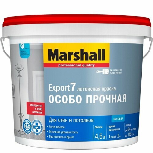 ![]() | 2430 ₽ | 14.06.2024 Краска Export-7 Особо прочная Marshall 4,5 л База A (белый) матовая | |