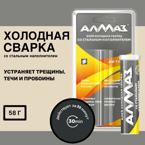 Холодная сварка алмаз сталь 58гр - используется для прочного, герметичного и надежного соединения деталей из черных и цветных металлов. Ликвидирует течи в трубах, резервуарах, радиаторах, бензобаках прямо по текущему топливу. Усиливает винтовые соединения. Содержит стальной наполнитель. Предназначен для прочного, герметичного и надежного соединения деталей из черных и цветных металлов, пластмасс, стекла, керамики, дерева, мрамора, бетона, гранита, оргстекла. Соединяет разнородные материалы, обеспечивая высокую адгезию и прочность, в том числе к мокрым и замасленным поверхностям.