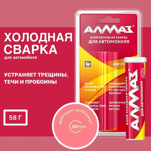 Холодная сварка для ремонта автомобилей Алмаз AZ-0039, 58 г 54869 быстро, прочно и герметично склеивает различные детали из черных и цветных металлов, стекла и пластика. Состав обеспечивает ремонт выхлопной системы и механических узлов в труднодоступных местах. Продут предназначен для герметизации соединений, затирки сколов и трещин в блоке цилиндров, картере двигателя, устранения течи в радиаторе и бензобаке. Клей можно использовать в условиях повышенной влажности для монтажа замасленных поверхностей.