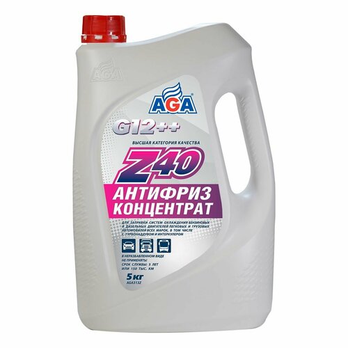 AGA-Z40 – универсальный антифриз высшей категории качества.Концентрат AGA-Z40 предназначен (после разбавления водой) для заправки систем охлаждения бензиновых и дизельных двигателей легковых и грузовых автомобилей всех марок, а также автобусов.Идеален для высокофорсированных двигателей, работающих в тяжелых условиях.Назначение:Концентрат предназначен (после разбавления водой) для заправки систем охлаждения бензиновых и дизельных двигателей легковых и грузовых автомобилей всех марок, а также автобусов. Идеален для высокофорсированных двигателей, работающих в тяжелых условиях.Спецификация:Разработан в соответствии с требованиями: ASTM D 3306/4985/6210; Chrysler MS-12106; BMW N600 69.0; VW, Audi, Porsche, Seat, Skoda: VW TL 774-G (G12++); Mercedes-Benz 325.3/325.5/325.6; Ford WSS-M97B44-D/E; Hyundai/Kia MS 591-08; Renault 41-01-001/-T; MAN 324 Type Si-OAT; CUMMINS CES 14603.Совместимость:Готовый антифриз Z40 эффективно заменяет антифризы других марок, соответствующие спецификациям: G11, G12, G12+, G12++, G13, допуская смешивание с ними в любом соотношении.Воспламеняемость:Готовый антифриз Z40 не горит, в его составе нет метанола и глицерина.Индивидуальные отличительные свойства:После добавления 0,93 л воды к содержимому канистры (1 кг), готовый антифриз Z40 обеспечивает:Эффективную работу системы охлаждения под давлением при температуре от –40 до +123 °С без смены антифриза до 5 лет или 150 тыс. км пробега.Защиту головки блока цилиндров от появления трещин благодаря улучшенному теплоотводу.Надежную защиту резиносодержащих деталей от растрескивания, всех металлов от коррозии и кавитации.Применение:Разбавьте концентрат дистиллированной водой согласно указаниям в таблице.Произведите смену охлаждающей жидкости согласно инструкции по эксплуатации. Не допускайте попадания антифриза на лакокрасочное покрытие!Объем воды на одну канистру концентрата Температура начала кристаллизации раствора1,00 л –33 °C0.89 л –40 °C0,85 л –44 °C0,70 л –52 °C0,55 л –61 °C0,00 л –13 °C* Рекомендуемое соотношение.Важно! Не рекомендуется заливать в систему охлаждения концентрат антифриза, не разбавленный дистиллированной водой.Это может повлиять на время прогрева и поддержание оптимального теплового режима двигателя.Состав: более 30 %: этиленгликоль; менее 5 %: ингибитор коррозии, пеногаситель, функциональные присадки, краситель.