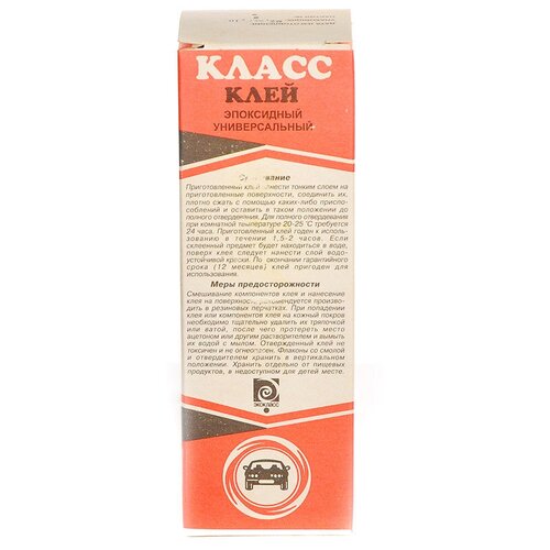 Данный клей является незаменимым подспорьем в быту. Применяемые в производстве клея современные синтетические смолы отличаются малой усадкой, высокой адгезией. Отвердевший клей не токсичен и не огнеопасен, и даже по окончании гарантийного срока клей пригоден для использования.Состав: Смола эпоксидная, пластификатор, отвердитель (пэпа).Время жизнеспособности смеси: 1.5-2 часа.Время полного отвердевания: 24 часа.ТУ: 2252-003-62517430-01.Срок годности: 12 месяцев.ПрименениеПоверхности, подлежащие склеиванию, очистить с помощью наждачной бумаги, после чего протереть тампоном, смоченным в ацетоне, бензине или спирте, и высушить на воздухе.Клеевой состав приготовить непосредственно перед использованием:Эпоксидную смолу перемешатьРазмешать 10-12 частей отвердителя в 100 частях подготовленной эпоксидной смолыДля уменьшения времени отвердевания эпоксидную смолу нагреть до температуры +40°СКлей может быть приготовлен с добавкой наполнителей, в качестве которых используется алюминиевая пудра и любые пигментные красители. Количество вводимого наполнителя определяется по консистенции клея.