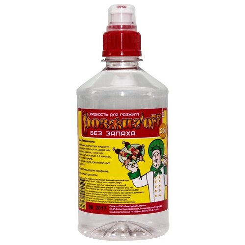 Предназначен для розжига древесного угля, дров, брикетов и другого твердого топлива. С его помощью вы без особых усилий сможете затопить камин, разжечь костер и мангал. Жидкость «Розжиг'off» отличается максимально длительным временем горения. Тщательно пропитанное таким средством твердое топливо разгорается равномерно, без резкого вспыхивания. «Розжиг'off» полностью выгорает, не влияет на вкус пищи, приготовленной на гриле, мангале или барбекю. При неукоснительном соблюдении инструкции по применению розжиг абсолютно безопасен для здоровья.