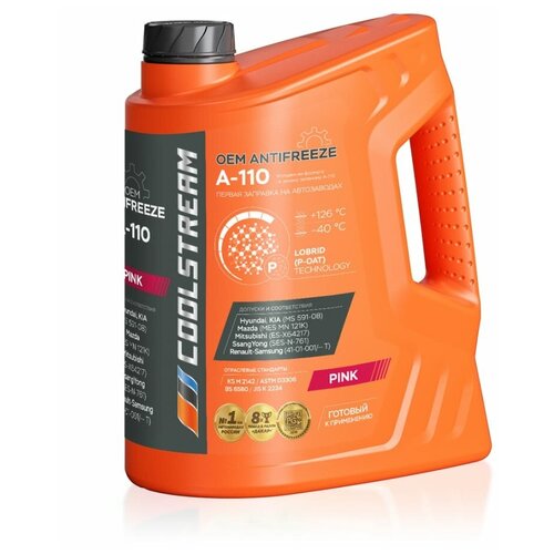 Охлаждающая жидкость CoolStream A-110 5 кг CS-010502-PN – фосфатный лобридный антифриз, использующийся для первичной заправки на заводах по производству автомобилей Hyundai и KIA. Обладает улучшенной формулой, благодаря чему отличается высокой стабильностью эксплуатационных свойств. Эффективно работает в широком диапазоне температур – от -40 до +126ºС.Соответствует требованиям: Mazda, Mitsubishi, Renault-Samsung, SsangYong, ASTM D3306, BS 6580, JIS K2234, KS M 2142.