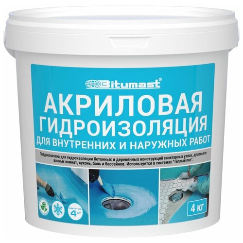 Акриловая гидроизоляция Bitumast, 4 кг предназначена для обработки поверхностей различного типа и может стать оптимальным решением при отделке кухни, бассейна, ванной комнаты, душевой и других помещений с повышенным уровнем влажности. Качественный результат достигается при нанесении средства как с помощью обычной кисти, так и валика, что обеспечивает комфортные условия для эксплуатации. Акриловая смесь полностью высыхает через 24 ч после использования. Эластичная пленка, которая образуется на обрабатываемом участке, надежно защищает швы от проникновения влаги.