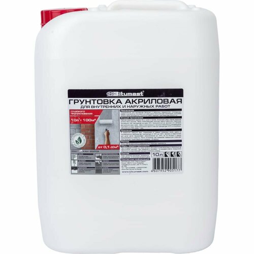 Грунтовка акриловая для внутренних и наружных работ. Предназначена для грунтования бетонных и кирпичных поверхностей, гипсокартона, дерева и др. пористых оснований для уменьшения впитывающей способности, улучшения адгезии перед проведением внутренних отделочных работ: окраской, приклеиванием обоев и т. д.Состав: вода, латексная дисперсия, технологические добавки.Технические характеристики:Расход: от 0,1 л/м2 Метод нанесения: кистью, валиком или методом распыленияКоличество слоев: 1-2Время высыхания между 2 слоями: около 1 часаВремя полного высыхания: около 1 часаЦвет: белыйСтепень блеска: нетОснова для колеровки: нетТипы работ: наружные и внутренниеОбъем: 10 лТемпература при нанесении: от +5 °С до +35 °ССтрана-производитель: РоссияКратность продажи: ШтЦена указана за: руб/Шт