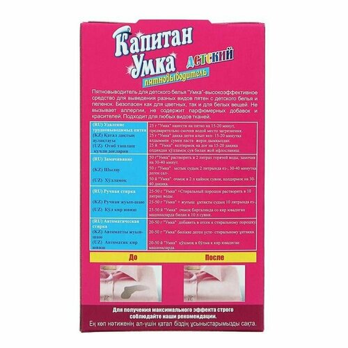 Пятновыводитель «Умка» удаляет сложные и застарелые пятна с любых тканей. Компоненты глубоко проникают в загрязнения и выводят их. Средство действует при температуре от 30 °С. Антиаллергенно.