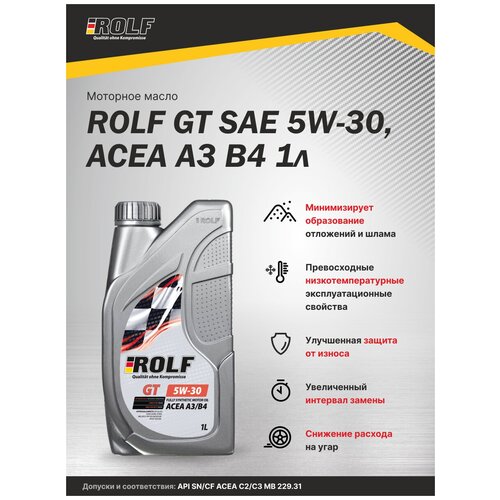 Полностью синтетическое моторное масло, предназначенное для максимальной защиты бензиновых и дизельных двигателей современных автомобилей, работающих в различных условиях эксплуатации. Обеспечивает быстрый и легкий запуск двигателя при самых низких температурах, превосходную защиту двигателя от износа и увеличенный интервал замены. Предотвращает образование отложений в масляной системе, имеет повышенную стойкость к топливу переменного качества (с содержанием серы до 500 ppm).ПрименениеROLF GT 5W-30 ACEA A3/B4 применяется в бензиновых и дизельных двигателях с высокими эксплуатационными характеристиками в легковых автомобилях, в том числе с турбонаддувом и системами нейтрализации отработавших газов. Для всесезонного применения. Рекомендовано как для новых двигателей, так и для двигателей с большим пробегом.Ключевые особенности• Прекрасная термическая и анти-окислительная стабильность масла минимизирует образование отложений и шлама• Улучшенная защита от износа продлевает срок службы двигателя и его узлов.• Способствует сбережению топлива и снижению до минимума расхода на угар.• Синтетическое базовое масло придает превосходные низкотемпературные эксплуатационные свойства.• Одобрено ведущими мировыми производителями к применению.• Обеспечивает увеличенный интервал замены моторного масла.