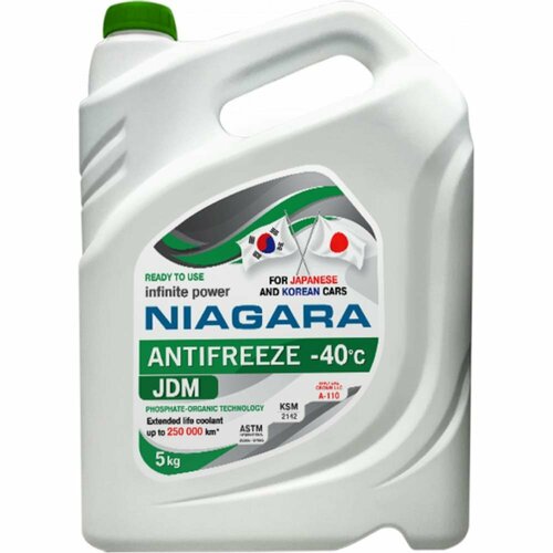 Жидкость охлаждающая Niagara JDM-40 Green — лобридный антифриз (P-OAT) на основе водного раствора этиленгликоля, воды и карбоксилатного пакета стабилизирующих и антикоррозионных присадок с добавлением фосфатных соединений. Является 100% аналогом ОЕМ антифриза «Crown LLC A-110» производимого компанией KUKDONG. Полностью соответствует техническим требованиям спецификации Hyundai-KIA - MS 591-08. Антифриз «Niagara JDM-40» Green – предназначен для применения в системах охлаждения бензиновых и дизельных двигателей автомобилей Hyundai и KIA, а также рекомендуется для систем охлаждения автомобилей MAZDA, MITSUBISHI, Ssang Yong и RENAULT-SAMSUNG. Антифриз «Niagara JDM-40» GREEN рекомендуется для автомобилей Hyundai и KIA до 2020 года выпуска. С 2020 года выпуска рекомендуется к использованию усовершенствованная охлаждающая жидкость Niagara JDM-40 Pink. Преимущества: Улучшенная высокотемпературная защита алюминияПротиводействие кавитационной коррозии водяного насосаВысокая стабильность эксплуатационных свойствУлучшенная совместимость с пластиками и эластомерамиПолная совместимость с требованиями стандартов автопроизводителей MITSUBISHI, MAZDA, Ssang Yong, RENAULT-SAMSUNG (1)Стабилен в условиях действия высоких температурУвеличенный ресурс эксплуатации до 10 лет или 250 000 км (2) (1) – сервисный интервал замены Антифриза должен соответствовать рекомендациям указанных автопроизводителей.(2) - при условии содержания системы охлаждения, ее компонентов и агрегатов, в исправном состоянии. СмешиваемостьЛучшие результаты работы Антифриза «NIAGARA JDM-40» GREEN достигаются при полной замене. Допускается смешивание «NIAGARA JDM-40» GREEN с другими органическими антифризами, произведенными по технологии «Р-ОАТ», соответствующими требованиям стандартов MS 591-08, MES MN 121 K, ES-X64217, 41-01-001/--T и SES-N-761 в такой пропорции, чтобы содержание антифриза «NIAGARA JDM-40» GREEN было не менее 80%. Во всех случаях смешивания «NIAGARA JDM-40» GREEN с другими марками аналогичных антифризов, следует помнить, что показатели качества, уровень защитных свойств, в том числе противокавитационные свойства, будут изменяться. Наилучшие защитные свойства обеспечиваются использованием только оригинального антифриза «NIAGARA JDM-40» GREEN, несмешанного ни с одним аналогом. ВниманиеАнтифриз допускается эксплуатировать в ДВС легковой, легкой коммерческой и коммерческой автомобильной технике, других производителей, предписывающих использование охлаждающих жидкостей, соответствующих требованиям: SAE J 1034, ASTM D 3306, KSM 2142 и JIS K 2234.