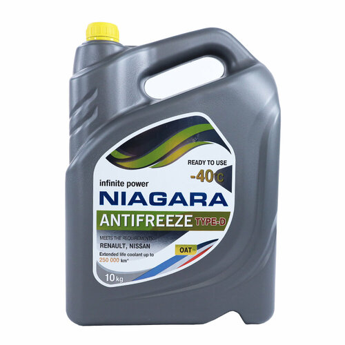 Жидкость охлаждающая "Антифриз" "Ниагара Type-D 40" (желтый) 10 кгАнтифриз «NIAGARA® TYPE-D» Профессиональная охлаждающая низкозамерзающая жидкость на основе этиленгликоля, специально подготовленной воды и органических ингибиторов коррозии. Не содержит нитритов, аминов, фосфатов, боратов и силикатов. Рекомендован для эксплуатации в системах охлаждения ДВС автомобилей: RENAULT-NISSAN и ПАО «автоваз».Цвет жидкости может варьироваться от желтого до желто-зеленого (это норма). Цвет НЕ является определяющим характеристики фактором!Разработана в полном соответствии с требованиями:RENAULT STANDARD 41-01-001/--T,PSA B71 5110,автоваз ТТМ 1.97.0717-2000,автоваз ТТМ 1.97.0731-99,ASTM D 3306, ASTM D 4985,SAE J 1034.преимущества: Длительный срок эксплуатации - до 250 000* км; Обеспечивает требуемый уровень отвода тепла от ДВС; Подходит для использования в ДВС из алюминия и чугуна; Нейтральна к полимерам, резинам и эластомерам; Не образует накипи и отложений**; Обладает улучшенными свойствами теплопередачи; Полностью совместима и заменяет антифриз «RENAULT GLACEOL RX TYPE D»; Эффективно защищает от коррозии алюминиевые, медные, латунные, стальные и чугунные элементы систем охлаждения. Нейтрален к припоям; Соответствует ASTM D2570; Обладает отличными моющими и нейтрализующими свойствами; Отлично подходит для эксплуатации в RENAULT DUSTER, RENAULT MEGANE, RENAULT SANDERO, RENAULT LOGAN I, II, NISSAN TERRANO, CITROEN C3, CITROEN C4, CITROEN C5, CITROEN BERLINGO, PEUGEOT 2008, PEUGEOT 3008, PEUGEOT 5008, PEUGEOT 408, PEUGEOT PARTNER, для автомобилей автоваз с двигателями автоваз и RENAULT, для автомобилей DACIA.*- при условии содержания системы охлаждения ДВС и ее агрегатов в исправном состоянии. **- при соблюдении требований по поддержанию уровня жидкости в системе, при соблюдении регламента замены жидкости и недопущении смешивания со сторонними охлаждающими жидкостями, при содержании системы охлаждения ДВС и ее агрегатов в исправном состоянии.внимание: Антифриз допускается эксплуатировать в ДВС легковой, легкой коммерческой и коммерческой автомобильной технике, других производителей, в том числе PEUGEOT и CITROEN, предписывающих использование охлаждающих жидкостей, соответствующих требованиям: RENAULT STANDARD 41-01-001/--T, ASTM D 3306, ASTM D 4985, SAE J 1034.смешиваемость. Лучшие результаты работы Антифриза «NIAGARA TYPE-D» достигаются при полной замене антифриза. Допускается смешивание и кратковременная эксплуатация антифриза «NIAGARA TYPE-D» с другими органическими антифризами, соответствующими требованиям стандартов RENAULT STANDARD 41-01-001/--T, ASTM D 3306, ASTM D 4985, SAE J 1034