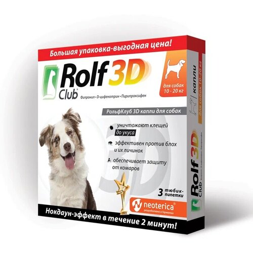 Рольф Клуб 3D от клещей и блох, для собак 10-20 кг, капли на холку, 1,5 мл. (3 пипетки)