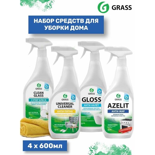 Набор средств для уборки от Grass. В набор для уборки входит: 1 Универсальное чистящее средство Clean Glass 600 мл средство для окон, стекол, зеркал, пластика, хрома, кафеля. Не оставляет подтеков, разводов. Придает поверхностям антистатические свойства. Может применяться в офисе для чистки мебели, диванов, мониторов, стекол, зеркал, торгового оборудования. 2 антижир Azelit Универсальное чистящее средство для кухни 600 мл . Удаляет жир, нагар, копоть и пригоревшую пищу с эмалированных, хромированных поверхностей, изделий из стекла, нержавеющей стали, фаянса, фарфора. Позволяет эффективно очистить сковородку, кухонную газовую плиту, газовую решетку, фритюрницу, подходит для гриля, духовки, микроволновки в домашних условиях. 3 Universal Cleaner спрей для уборки 600 мл. Универсальное чистящее средство широкого спектра действия, для ковров, мебели, ковролина, дивана, подошвы обуви. Средство можно использовать не только для чистки ковров, мебели, а также очистить ткань и как пятновыводитель. Универсальный подарок для Вашего дома. 4 Gloss Чистящее средство для ванной Gloss средство для акриловых ванн для кухни 600 мл Бытовая химия от Грасс- это высокоэффективные средства для ванны, для сантехники, для кухни, для пола, для стёкол, из которых можно составить отличный набор для уборки вашего дома.