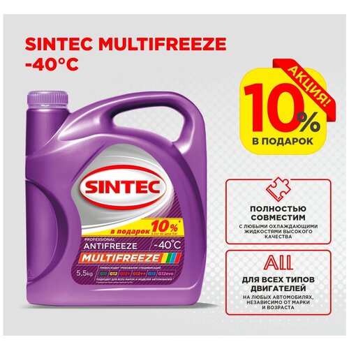 Универсальный антифриз Sintec MULTI FREEZE изготовлен по уникальной гибридной технологии, которая сочетает преимущества карбоксилатных и силикатных антифризов. Антифриз производится на основе моноэтиленгликоля и пакета многопрофильных присадок с органическими и неорганическими добавками.Sintec MULTI FREEZE может применяться во всех типах двигателей и моделей автомобилей . За счет применения новейших пакетов присадок, новый антифриз полностью совместим со всеми металлами и полимерными материалами. Устойчив к кавитации. Sintec MULTI FREEZE полностью совместим с любыми качественными охлаждающими жидкостями. Это позволяет, в случае необходимости, использовать его в качестве доливочной жидкости в систему охлаждения и использовать при замене охлаждающей жидкости в системе охлаждения независимо от того, какой тип антифриза использовался ранее.Sintec MULTI FREEZE рассчитан на весь срок эксплуатации автомобиля. Неорганические компоненты присадки образуют на поверхности материалов системы охлаждения прочную защитную пленку, а карбоновые кислоты защищают только места образования коррозии.Устраняет причины возможных протечек радиатора, засорения термостата и поломки водяного насоса.Обеспечивает защиту алюминиевых деталей при высоких температурах и в условиях высоких нагрузок.Исключает образование накипи и других отложений в системе охлаждения. Предотвращает кавитацию, увеличивает срок службы водяного насоса системы охлаждения.Преимущества мультифриза Sintec:Рассчитан на весь срок эксплуатации авто. Охлаждающую жидкость Sintec не придется регулярно менять, как в случае с обычным антифризом, рассчитанным в среднем на 30–50 тыс. км. Необходимость в его замене может возникнуть лишь при ремонте системы охлаждения или в ситуациях, когда состав был смешан с низкокачественным антифризом.Эффективно отводит тепло. Эффективный теплоотвод снижает риск перегрева и обеспечивает оптимальный температурный режим работы мотора.Содержит флуоресцентные добавки. Специальный маркер, добавленный в состав мультифриза, позволяет с высокой точностью обнаруживать места утечек охлаждающей жидкости через изношенные уплотнения, плохо затянутые патрубки или поврежденные участки радиатора.Следы ОЖ можно выявить с помощью ультрафиолетовой лампы.