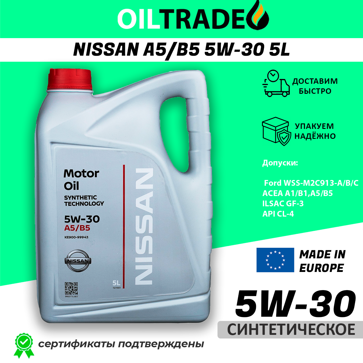 Номер KE90090043R. Оригинальное синтетическое моторное масло Ниссан 5w30 A5/B5 предназначено для использования в дизельных и бензиновых двигателях, включая модификацию с турбинами. Масло Nissan 5w-30 является всесезонным материалом, может использоваться при температурах от –35°C до +40°C. При низких температурах имеет высокий коэффициент текучести, поэтому быстрее поступает к трущимся деталям и уменьшает трение при холодном запуске, повышая моторесурс и топливную экономичность.Масляная основа обладает отличным противо-окисилительным свойством и предотвращает отложения на внутренних элементах двигателя, повышая срок эксплуатации без потери свойств масла Nissan 5в30. Nissan масло моторное обладает специальной основой, которая позволяет повысить адгезию к металлу. Поэтому масло Ниссан 5w 30 дольше остается на стенках двигателя, продлевая срок его службы.Mоторное масло Ниссан подходит для любых условий эксплуатации и особенно пригодно в тяжелых условиях. Моторные масла 5 W30 полностью адаптированы для всех стилей вождения. Оригинальное масло Ниссан 5w30 5 литров высокого качества разработано специально для автомобилей японского концерна Nissan — проверить подлинность можно с помощью кода, который указан на оборотной стороне канистры под специальным стикером с защитным покрытием.Имеет допуски: ACEA A5/B5; API SL/CF; EC; SM/CF; Nissan; Renault RN0700; Renault RN0710; Porsche A40; GM-LL-B-025; PSA B71 2296.