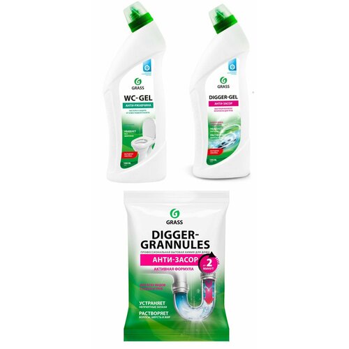 Grass Чистящее средство для сантехники WC-Gel, 1 л - Кислотное чистящее средство для чистки унитазов, фаянсовых изделий, кафеля от известкового налета, потеков ржавчины, солевых отложений. Способствует устранению неприятного запаха, убивает микробы. Гелеобразная структура чистящего средства обеспечивает его экономичный расход. Не держать на хромированных деталях более 30 секунд.Grass Средство для прочистки труб Digger grannules, 70 г - Быстродействующее высокоэффективное средство для прочистки всех видов труб в домашней канализации: 1 саше (70 грамм) на 1 применение. Digger grannules предназначено для мгновенной ликвидации особо сложных засоров, а так же для профилактики возникновения засоров и устранения неприятных запахов в ванной и на кухне: при попадании в канализацию остатков пищи (кофе, чай, чешуя рыб и др), жировых остатков, волос, шерсти животных, полиэтилена и т.д. Благодаря специально разработанному составу на основе композиции тройного действия, достигается высокая эффективность средств.Grass Гель для устранения засоров Digger-Gel, 1 л - Высокоэффективное средство для устранения засоров в труднодоступных местах канализационных стоков и труб.Убивает бактерии и устраняет неприятные запахи. Идеально подходит для всех видов металлических и пластиковых труб.Быстро растворяет жировые и белковые отложения, волосы, остатки пищи, действует на всей протяженности трубы.Густая формула позволяет еще эффективнее справляться с засорами.