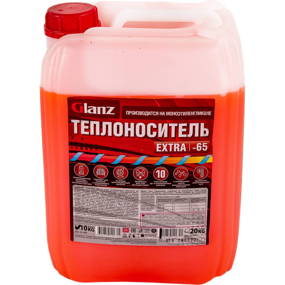 Теплоноситель (-65; 10 кг; моноэтиленгликоль) Extra Glanz GL400 - изготовлен на базе моноэтиленгликоля рекомендован для одноконтурных систем отопления в качестве рабочей жидкости, обеспечивающей работу вспектре температур от –65°С до +116°С.Перед заливкой теплоносителя Glanz Extra в новую систему отопления нужно провести гидроиспытания и проверить ее работу.Проверки проводить при высокой температуре на дистиллированной воде, а при низкой – на теплоносителе для систем отопления. При обнаружении негерметичности слить жидкость, убрать протечки и возобновить испытание. При позитивном тестировании продолжить заливку теплоносителя, в случае если заливали теплоноситель, в случае если заливали воду, то слить воду и залить в систему теплоноситель.Перед заливкой теплоносителя в старенькую систему нужно сначала ее помыть дистиллированной водой Glanz, а в случае необходимости - средством для чистки системы отопления.Для удаления воздуха из системы отопления рекомендовано впоследствии наполнения системы теплоносителем выдержать ее без давления 2-3 часа. Не рекомендовано: заливать теплоноситель для отопления в системы, изготовленные из покрытых цинком труб, так как водогликолевые смеси при содействии с цинком образуют объемистые осадки, которыезаблокируют работу системы, использовать теплоноситель для отопления Glanz Extra в системах скотлами электродного на подобии (системы галан).Перемешивать с теплоносителями, изготовленными не на моноэтиленгликоле.
