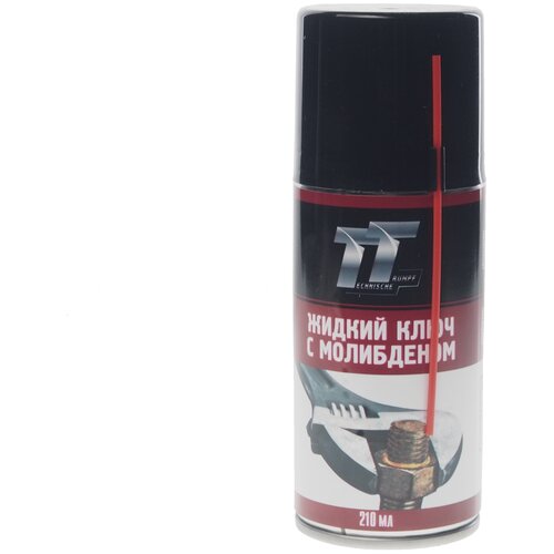 Жидкий ключ с молибденом TT 210 мл, аэрозоль WDM02/50 - смазка глубокого проникновения. Предназначается для облегчения отвинчивания заржавевших резьбовых соединений, смазывания трущихся поверхностей, устранения скрипов и заедания деталей, для вытеснения влаги с поверхности различных деталей двигателя автомобиля. Также применяется для смазки шкивов, цапф, тросовых, цепных и зубчатых передач, скользящих опор, дверных замков, петель и т.  п. Способна поддерживать малый коэффициент трения скользящих поверхностей даже при сильных нагрузках. Наличие дисульфида молибдена гарантирует сохранение смазывающих свойств даже в тех случаях, когда сама смазка уже истощена. Смазка долговечна, устойчива к кислотам, солям, щелочам. Сохраняет неизменными смазывающие свойства от -40°С до +120°С. Придает обработанным деталям водоотталкивающие свойства. Глубоко проникая в зазоры между деталями, смазка размягчает и растворяет ржавчину, быстро возвращая подвижность резьбовым соединениям. Входящий в состав смазки дисульфид молибдена, дополнительно снижает трение и способствует легкости демонтажа. Обеспечивает долговременный эффект, продолжая работать при повторном использовании обработанных деталей. Обладает антикоррозионным действием, вытесняет влагу и придает обработанным деталям водоотталкивающие свойства.