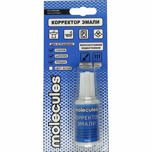 Корректор эмали Molecules (белый; 20 мл) KMLS750 предназначен для устранения мелких повреждений на эмалированных, керамических и фаянсовых изделиях. Морозостойкий и водостойкий. Прост в использовании, быстросохнущий.