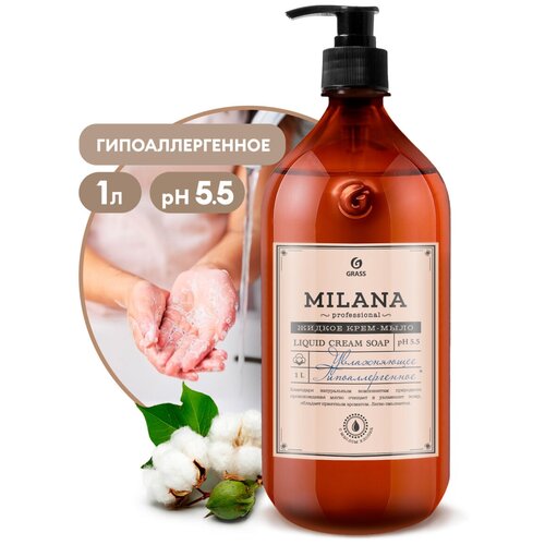 Жидкое мыло крем-мыло Грасс Milana Professional с высококачественным экологичными компонентами природного происхождения для ежедневного мытья рук взрослых и детей. Экологичная органическая основа данного пенного средства личной гигиены, обеспечивает мягкое деликатное очищение нежной и чувствительной кожи тела, удаление загрязнений. Обладает питательным и интенсивным увлажняющим эффектом как натуральное, а также защищает от бактерий. Особенно это важно для маленьких детей. Ароматизированное густое косметическое мыло с маслом хлопковых семян без красителей Грас Милана подойдет для любого дозатора или диспенсера в вашей ванной. Гигиеническое гипоаллергенное средство представлено в объеме 1 литр, поэтому станет оптимальным решением в хозяйстве для большой семьи.