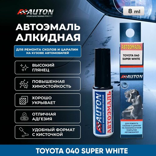 Краска для автомобиля / Автоэмаль алкидная AUTON для TOYOTA 040 SUPER WHITE, флакон с кисточкой, 8 мл