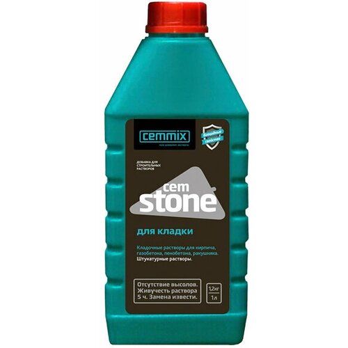 Придает смеси пластичность. Увеличивает живучесть раствора до 5 часов. Улучшает обрабатываемость, регулирует консистенцию. Расход зависит от требуемого уровня подвижности смеси, качества и чистоты используемых в замесе материалов. Для определения более точных результатов по расходу добавки необходимо проводить предварительный контрольный замес, исходя из текущих условий окружающей среды по влажности, содержания цемента в сухой смеси, качества и влажности песка и инертных заполнителей. Преимущества: - Повышает удобоукладываемость бетонных и растворных смесей с П1 до П4; - Препятствует образованию высолов на поверхности кирпича; - Снижает водопотребность бетонной/растворной смеси на 10 – 20 %; - Уменьшает усадочные деформации на 50%; - Обеспечивает до 5 часов сохранности раствора; - Увеличивает долговечность, морозостойкость и водонепроницаемость растворного шва; - Позволяет работать на всех видах песка; - Обеспечивает 100% прочности на 7 сутки; - Экономит цемент. CemStone может комбинироваться с другими материалами Cemmix. Для получения необходимых свойств бетонной смеси при использовании CemStone с другими добавками необходимо провести лабораторные испытания для оптимизации состава бетонной смеси и проверки свойств бетона. Комплексная добавка для кладочных и строительных растворов. Препятствует расслоению и водоотделению растворной смеси. Основа: водный раствор синтетических ПАВ; Внешний вид: непрозрачная жидкость светло-коричневого цвета; Плотность: 1,18 кг/дм³ (при 20 °C); Показатель pH: 9,5 - 11,0; Расход: 0,25 - 0,5 л на 100 кг цемента; Объём: 1 л.