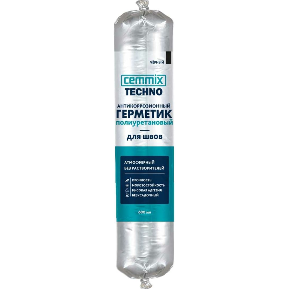 Полиуретановый герметик Cemmix для швов с ингибитором коррозии Cemmix обеспечивает герметизацию и антикоррозионную защиту металла, бетона, железобетона. Швы, сварные швы и соединения, полости, соединения на изделиях, зданиях и сооружениях. Внутри и снаружи помещений. После полимеризации герметик может быть окрашен. Используется в быту и при проведении строительных работ. Главная функция - защита от сквозняков, влаги и других негативных воздействий. Объем: 600 мл; Цвет: черный; Основа: полиуретан; Состав: модифицированный преполимер, функциональные добавки, наполнители, колоранты; Плотность: 1,5 ± 0,05 кг/л; Относительное удлинение при разрыве: 250%; Скорость полимеризации (при +20°С, 65% ОВ): 2/24 мм; Начальное время полимеризации: 75 мин; Температура эксплуатации: от -40 до +60 °С; Температура нанесения: от -15 до +25 °С.