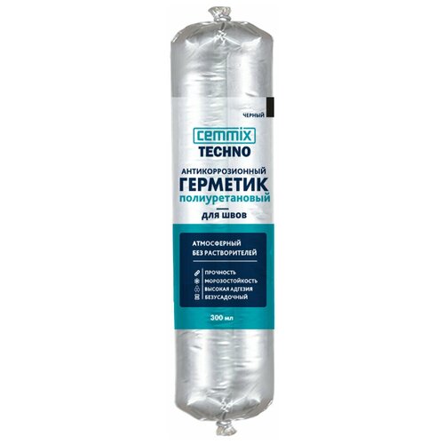 Полиуретановый герметик Cemmix для швов с ингибитором коррозии Cemmix обеспечивает герметизацию и антикоррозионную защиту металла, бетона, железобетона. Швы, сварные швы и соединения, полости, соединения на изделиях, зданиях и сооружениях. Внутри и снаружи помещений. После полимеризации герметик может быть окрашен. Используется в быту и при проведении строительных работ. Главная функция - защита от сквозняков, влаги и других негативных воздействий. Объем: 300 мл; Цвет: черный; Основа: полиуретан; Состав: модифицированный преполимер, функциональные добавки, наполнители, колоранты; Плотность: 1,5 ± 0,05 кг/л; Относительное удлинение при разрыве: 250%; Скорость полимеризации (при +20°С, 65% ОВ): 2/24 мм; Начальное время полимеризации: 75 мин; Температура эксплуатации: от -40 до +60 °С; Температура нанесения: от -15 до +25 °С.