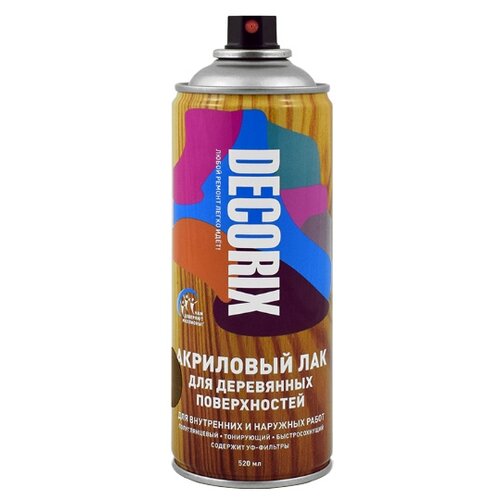 Высококачественный тонирующий акриловый лак DECORIX предназначен для декорирования поверхности под ценные породы дерева, придания желаемого цвета и подчёркивания естественной текстуры древесины. Создаёт защитно-декоративное покрытие при бытовом применении, декоративно-оформительских работах, строительстве и ремонте.Применяется для лакирования мебели, дверей, садовой мебели, багета, декорирования помещений и других видов творческих и хозяйственных работ. Лак обеспечивает устойчивость покрытия к механическим воздействиям и истиранию, обладает оптимальным соотношением твёрдости и эластичности, содержит УФ-фильтры. Образуемое покрытие устойчиво к воздействию воды и бытовой химии.Аэрозольный лак удобен для лакирования небольших и труднодоступных поверхностей.
