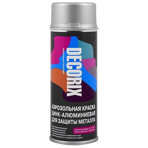 Высококачественная полиуретановая краска с высоким содержанием цинка и алюминия DECORIX предназначена для защиты от коррозии и декоративного окрашивания металлических поверхностей, в том числе оцинкованных поверхностей и алюминия, при бытовом применении, декоративно-оформительских работах, строительстве и ремонте.Применяется для окрашивания и антикоррозийной обработки металлических изделий и конструкций, крыш, водосточных труб, наружных отливов, оград, швов стальных конструкций, консервации поверхностей и т. п.Аэрозольная эмаль удобна для окрашивания небольших поверхностей и труднодоступных мест. Краска образует матовое металлизированное покрытие с высокими антикоррозионными свойствами.