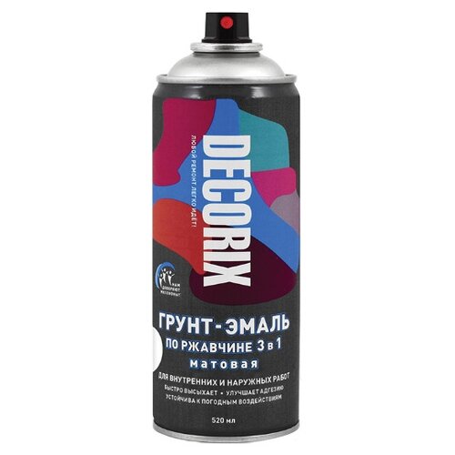 Высококачественная грунт-эмаль по ржавчине DECORIX матовая предназначена для защитно-декоративного окрашивания заржавевших или подверженных коррозии поверхностей из сплавов чёрных металлов при бытовом применении, декоративно-оформительских работах, строительстве и ремонте.Предназначена для окрашивания: древесины, пластика, металла, бетона, кирпича, керамики, стекла, картона и минеральных поверхностей. Сочетает в себе свойства нейтрализатора коррозии, грунтовки и защитно-декоративной эмали («3 в 1»), что позволяет сократить время на подготовку поверхности перед окрашиванием. Применяется для ремонтного окрашивания металлических изделий, инструментов и других видов работ.Аэрозольная грунт-эмаль по ржавчине удобна для окрашивания не больших поверхностей и труднодоступных мест. Также подходит для поверхностей из древесины, бетона, камня, стекла, керамики и некоторых видов пластмасс. Грунт-эмаль образует гладкое матовое покрытие, устойчивое к выцветанию.