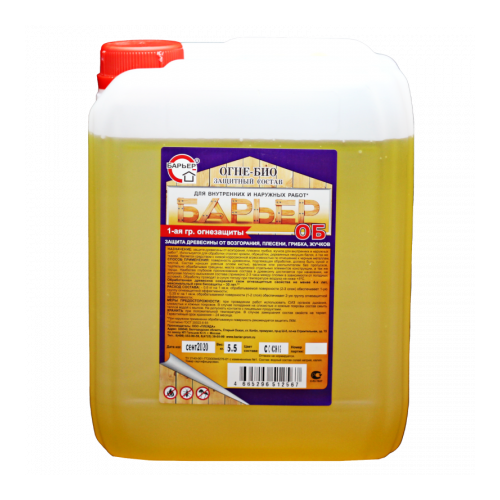Огнебиозащитный состав Барьер-ОБ предназначен для уменьшения горючести древесины, а также для ее защиты от поражения грибами, водорослями и жуками-древоточцами.Раствор обеспечивает 1-ю (высшую) группу огнезащитной эффективности. После обработки древесина сохраняет огнезащитные свойства не менее 4-х лет, биозащитные — до 30 лет (согласно ГОСТ 20022.6-93). Продукт тонирует материал в золотисто-желтый оттенок «сосна».