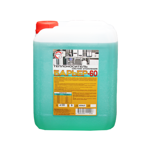 Теплоноситель систем отопления «Барьер-60» специально разработан с учетом высоких требований безопасности для здоровья людей. Пропиленгликоль безвреден для человека. Например, он применяется в качестве разрешенной пищевой добавки. Теплоносители на основе пропиленгликоля рекомендованы для использования в автономных системах отопления в детских, медицинских и оздоровительных учреждениях.«Барьер-60» предохраняет систему от «размораживания» при низких температурах и хорошо подходит для коттеджей, дач, сельских домов. Кроме того, «Барьер-60» защищает оборудование от коррозии и накипи, потому что в его состав добавлены специальные присадки. Эти добавки предотвращают разрушение внутренней поверхности батарей и труб, а также улучшают эксплуатационные характеристики котла.Однако не рекомендуется использовать это средство для систем с электродными котлами или оцинкованными деталями, т. к. пропиленгликоль вступает в реакцию с цинком.Теплоносители «Барьер-60»: — предотвращают разрушение («размораживание») систем отопления и кондиционирования при замерзании; — обладают высокой теплоемкостью, что позволяет теплоносителю накапливать и отдавать большое количество тепла; — Отличаются высокой стабильностью, поэтому в автономных системах отопления их можно использовать не менее 5 лет; — Не содержат токсичных веществ, безопасны для здоровья людей даже при длительном вдыхании паров; — Включают пакет присадок, защищающих оборудование теплообменных систем от накипи и коррозии; — Не пенятся и не разъедают пластик и металлопластик, резину, паранит и лен; — Взрыво- и пожаробезопасны.При температуре -60˚С «Барьер-60» применяют неразбавленным. При большей температуре теплоноситель разводят водой. На каждые 10 литров средства в зависимости от температуры нужно:при -40˚С добавить 2,2 л воды;при -30˚С добавить 4,2 л воды;при -25˚С добавить 5,8 л воды;при -20˚С добавить 8,0 л воды;при -15˚С добавить 11,2 л воды.