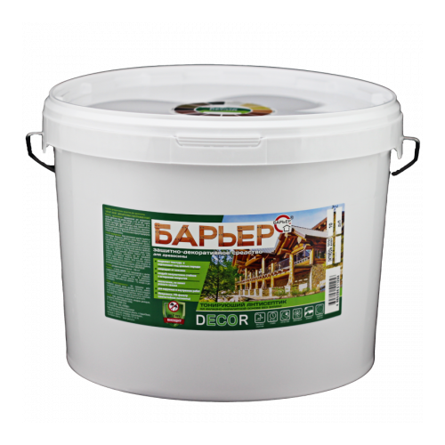 Пропитка на алкидно-акрилатной основе Барьер Decor тонирует древесину и одновременно защищает её от гниения и поражения грибком.Антисептик создает на поверхности полуматовое покрытие, которое подчеркивает природную текстуру материала и маскирует мелкие дефекты основания. Благодаря входящему в состав продукта микровоску, покрытие отличается высокой стойкостью к ультрафиолету, механическим воздействиям и истиранию. Поэтому защита от биопоражений сохраняется в течение 7 лет.«Барьер Decor» не имеет запаха, не выделяет токсических веществ.