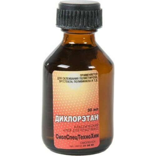Клей для оргстекла ZeepDeep дихлорэтан ДХЭ, флакон-стекло 30 мл 602162 предназначен для склеивания корпусных поверхностей из пластмассы (изделия из оргстекла, полистирола или полиметилметакрилата (ПММА)), для использования в производстве в качестве растворителя (в составе красок, средств для снятия лака, полирующих средств), а также как средство для обезжиривания различных материалов (растворяет жиры, воск, смолы, входит в состав пятновыводителей).Продукт представляет собой бесцветную легковоспламеняющуюся жидкость со сладковатым запахом (похожим на запах хлороформа) и практически не растворяется в воде.Перед склеиванием необходимо из стружек оргстекла (от 2 до 3%), или полистирола (от 8 до 12%) и небольшого количества дихлорэтана сделать клейкую массу (смешивая до консистенции сметаны). Далее нанести тонким слоем на обе обезжиренные поверхности, плотно прижать друг к другу и зафиксировать. Время склеивания от 30 минут до 10 часов (зависит от площади склеиваемых материалов).