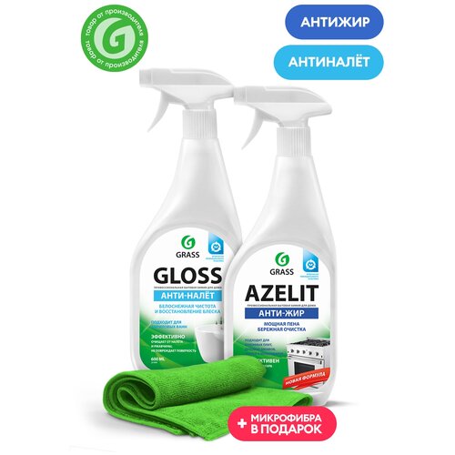Набор ГраСС (Grass) антижир + антиналет предназначен для ухода за ванной и кухней, в состав которого входят: Средство для уборки кухни чистящее средство для кухни Azelit Антижир от GRASS современный помощник для ежедневной уборки дома. Азелит универсальное чистящее средство для плиты, эффективно удаляет жир, нагар, копоть и пригоревшую пищу с эмалированных, хромированных поверхностей, изделий из стекла, нержавеющей стали, фаянса, фарфора концентрированное средство для удаления жира, нагара и копоти со сковородок, кухонных плит, коптильных камер, фритюрниц, грилей, духовых шкафов, микроволновых печей и др. Для плиты средство содержит активные чистящие вещества, которые помогают максимально эффективно справиться с застарелыми загрязнениями.Универсальное чистящие средство спрей Gloss 0,6 л от компании Грасс для ванной комнаты - профессиональная бытовая химия для дома. Подходит для чистки ванны, раковины, джакузи, бассейна, сантехники, фаянсовых изделий и кафеля от известкового налета, потеков ржавчины, мыльных разводов и солевых отложений не повреждая поверхность. Эффективно удаляет сложные и застарелые загрязнения. Безопасно для стеклокерамических, металлических акриловых поверхностей, раковин из нержавеющей стали. С помощью спрея даже генеральная уборка в доме проходит легко и быстро. Придает поверхности чистоту и блеск, сохраняя эффект антиналет на несколько дней. Не придется использовать набор скребок и жестких щеток, достаточно мягкой тряпки, губки и салфетки. Многофункциональное дезинфицирующее средство не содержит хлора и щелочных веществ. Приобретая чистящие и моющие товары GRASS,