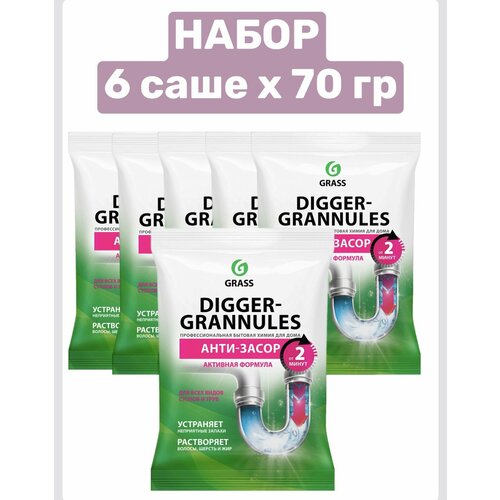 Grass Средство для чистки стоков и труб Digger-Grannules / грасс Диггер-Гранулы Анти-засор, для всех видов труб и стоков, (саше 70 гр), 6 шт