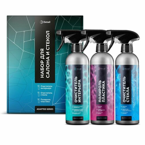 Набор для ухода за салоном и стёкла автомобиля Adapted Series Detail включает в себя готовые к применению составы для ухода за интерьером и стёклами автомобиля. Adapted Series Detail — это линейка составов для самостоятельного ухода за автомобилем. Продукты линейки разработаны таким образом, что для их использования не требуется профессиональных навыков. Сбалансированные формулы составов позволят вернуть обрабатываемым поверхностям первоначальный вид, как при профессиональном уходе.В набор входит:очиститель интерьераУниверсальный очиститель интерьера автомобиля. Чистящее средство Ultra Clean – универсальный очиститель интерьера автомобиля. Деликатно и эффективно очищает любые поверхности внутри салона автомобиля, включая различные виды тканей, алькантару, замшу, детали из пластика, обвивку крыши, отделку дверей. Средство бережно удаляет даже стойкие загрязнения, не оставляя следов и разводов. Придает первоначальный естественный вид обработанной поверхности, не повреждая ее. Состав готов к применению.Способ применения:1. Обеспыльте загрязненную поверхность. 2. Нанесите состав на мягкую губку или щетку. 3. Распределите состав по поверхности и поработайте круговыми движениями. 4. Влажным микрофибровым полотенцем протрите очищаемую поверхность для удаления состава.полироль пластикаСостав для ухода за пластмассовыми поверхностями внутри салона. Полирующее средство Plastic - средство для ухода за пластиковыми элементами интерьера автомобиля. Средство восстанавливает естественный матовый вид внутренней отделки из пластика и маскирует незначительные повреждения. Входящие в состав консерванты придают обрабатываемой поверхности антистатические свойства, защищают от воздействия УФ-лучей и способствуют предотвращению выцветание пластмассовых поверхностей. Состав готов к применению.Способ применения: 1. Тщательно очистите поверхность при помощи универсальных очистителей, например, Ultra Clean.2. Пропитайте микрофибровый аппликатор или микрофибровое полотенце составом Plastic. 3. Равномерно распределите состав по обрабатываемой поверхности.4. Дайте составу впитаться в течение 30-60 секунд, после чего уберите излишки состава микрофибровым полотенцем.очиститель стеклаОчиститель стекол на спиртовой основе. Чистящее средство Clean Glass – очиститель стекол автомобиля на спиртовой основе. Легко и эффективно очищает стеклянные поверхности, создавая условия для приятного и безопасного вождения автомобиля. Подходит для зеркал, тонирующих пленок и других спиртостойких поверхностей. Не оставляет разводов и придает поверхности антистатические свойства. Состав готов к применению.Способ применения:1. Распылите состав на микрофибровое полотенце. 2. Тщательно протрите поверхность при помощи микрофибрового полотенца. При необходимости повторите.