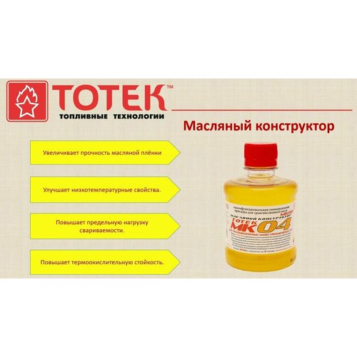 Масляный Конструктор тотек МК-04Препарат тотек МК-04 предназначен для улучшения рабочих характеристик трансмиссионных масел - таких как прочность масляной плёнки, повышения сдвиговых пределов её прочности и улучшения их низкотемпературных свойств, повышения предельной нагрузки свариваемости, снижения температуры в зоне контакта, повышения термоокислительной стойкости. Новая линейка продуктов для изменения физико химических и трибологических свойств моторных и трансмиссионных масел, получившая рабочее название: «Масляный Конструктор» Смещает рабочие характеристики в высшую категорию например масло GL-5 в допустимую рабочую зону для масел группы GL-6 и повышая предельную вязкость при 100⁰С.