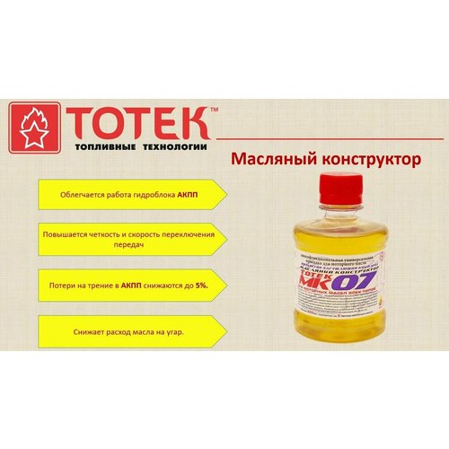 Масляный конструктор тотек МК-07Препарат «тотек МК-07» предназначен для увеличения вязкости всех типов моторных масел, как синтетических, так и минеральных. В процессе работы моторные масла снижают свою вязкость в следствии деструкции загущающих компонентов. Потеря вязкости приводит к ухудшению рабочих характеристик масла, понижения давления в масло подающем тракте, что может послужить причиной повышенного износа деталей двигателя. Резкое падение уровня масла ниже минимально допустимого значения (в следствии его выброса через различные уплотнения сальники), может привести к разрушению двигателя и его поломке.