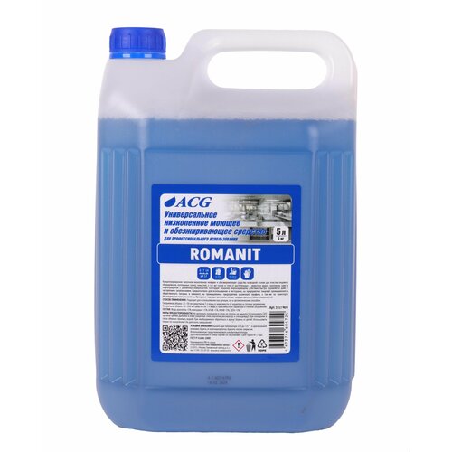 Универсальное низкопенное моющее средство для уборки помещений ROMANIT ACG 5л.Концентрированное щелочное низкопенное моющее и обезжиривающее средство на водной основе для очистки пищевого оборудования, коптильных камер, емкостей, а так же полов и стен от растительных и животных жиров, протеинов, сажи и нефтепродуктов с различных поверхностей. Благодаря мощному эмульгирующему действию быстро справляется даже с застарелыми загрязнениями. Предназначено для использования в ресторанах, на предприятиях пищевой промышленности, общественного питания, в клининге, на промышленных предприятиях различного профиля, а так же на транспорте. Не повреждает моющие системы. Прекрасно подходит для мытья любых твердых щелочестойких поверхностей.pH 12Способ применения:Подходит для использования как ручным, так и автоматическим способом.Ежедневная уборка: 25-50мл средства на 5л воды, в зависимости от характера и степени загрязнения.Генеральная уборка: 60-100мл средства на 5л воды, в зависимости от характера и степени загрязнения.Меры предосторожности:Рекомендуется использовать резиновые перчатки. При попадании на кожу или слизистые оболочки промыть большим количеством воды. При необходимости - обратиться к врачу.ГОСТ Р 51696-2000