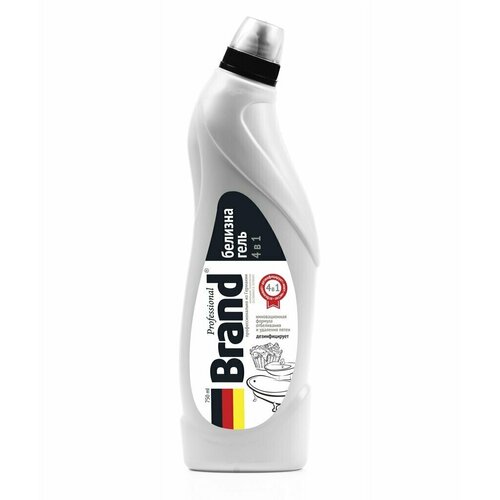 4 в 1: эффективно очищает любые загрязнения, дезинфицирует, моет и отбеливает. Формула белизны-геля Professional Brand была разработана известной немецкой компанией Zschimmer & Schwarz, одним из мировых лидеров химической промышленности. Белизна позволяет эффективно отбеливать хлопковые и льняные ткани. Дезинфекция пола, стен, кафельной плитки, фарфоровой и эмалированной посуды, сантехники, мусорных вёдер, клеток, лотков животных, воды в бассейнах и т. д. Средство позволяет удалять пятна и стойкие загрязнения на различных поверхностях. Прочищает канализационные стоки. В средстве применена инновационная формула отбеливания и удаления пятен. Гелевая структура средства обеспечивает экономичный расход и увеличивает эффективность его использования. Состав: Вода деионизированная (30% и более), натрия гипохлорит (15% или более, но менее 30%), анионный ПАВ (менее 5%), неионогенный ПАВ (менее 5%), стабилизатор (менее 5%).
