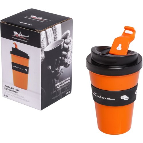 Товарное предложение: Стакан для кофе и др. напитков, герм. крышка, 350 мл, пластик, черн./оранж. AIRLINE