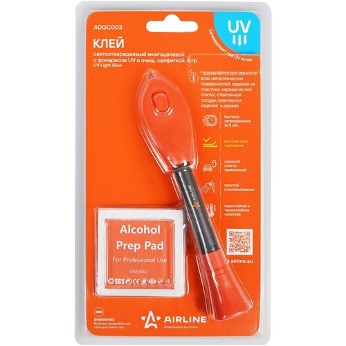 AIRLINE ADGC003 Клей светоотверждаемый многоцелевой c фонариком UV и очищ. салфеткой, 4 гр.