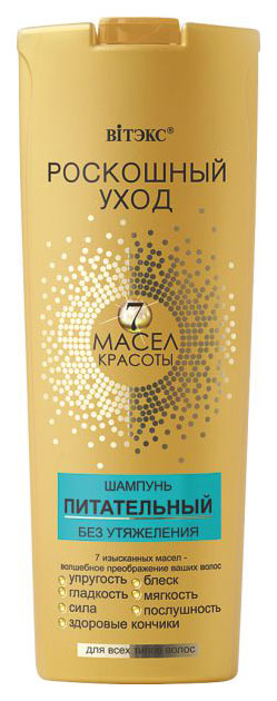 Шампунь Витэкс Роскошный Уход 7 масел красоты Питательный мягко и бережно очищает, питает и восстанавливает волосы по всей длине, предотвращая появление секущихся кончиков, уменьшает ломкость волос. Придает им невероятный ослепительный блеск, зеркальную гладкость, мягкость и шелковистость.