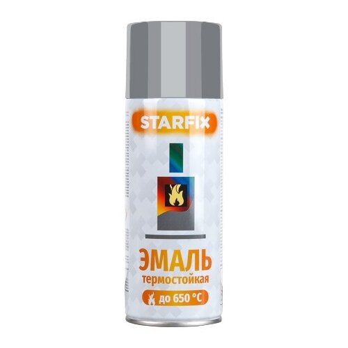 Эмаль-аэрозоль STARFIX кремнийорганическая термостойкаяДля наружных и внутренних работ.Для окрашивания металлических (стальных, чугунных) поверхностей, подвергающихся воздействию высоких температур (до 650 °С): составные части выхлопной системы автомобилей, элементы трубопроводов и паропроводов, детали водонагревательного, котельного и прочего оборудования, камины, барбекю, радиаторы отопления и др.Сферы применения: металлообработка.Свойства: легко наносится в труднодоступные места, имеет хорошую укрывистость и адгезию к металлическим поверхностям (сталь, чугун), быстро сохнет, образует термостойкое покрытие.Внешний вид материала: внешний вид покрытия - однородная, без кратеров, пор, морщин и посторонних включений поверхность. Подготовка поверхности: термостойкость зависит от степени подготовки поверхности (чистота металла, степень шероховатости). Для достижения термостойкости 400-450 °С требуется очень тщательная ручная или механическая очистка металла до появления металлического блеска (степень очистки - St3 по СТБ ISO 8501-1), затем обработка абразивными материалами (шлифовальная шкурка Р60, Р80) для придания шероховатости, после чего обезжиривание растворителем (марки 646, 647, Р-12, ацетон, ксилол, бутилацетат).Для достижения максимальной термостойкости 650 °С требуется очень тщательная пескоструйнаяобработка изделия (степень очистки Sa 2,5 по СТБ ISO 8501-1), а также тщательная обработка сварных швов с устранением большинства дефектов (степень очистки Р2 по СТБ ISO 8501-3), затем обдув сжатым воздухом.Не грунтовать! После подготовки металла - незамедлительное окрашивание.Способ и условия нанесения: не наносить на горячие поверхности! t окрашиваемой поверхности должна быть на 5 °С выше точки росы, t баллона - не ниже 10 °С и не выше 40 °С. Перед нанесением баллон встряхнуть в течение 2-3 мин после появления стука шариков, а также периодически встряхивать во время использования. Сделать пробное распыление. Распылять в вертикальном положении с расстояния 25-30 см от поверхности в 2-3 тонких слоя с промежуточной сушкой 5-7 мин. Для достижения максимальной термостойкости